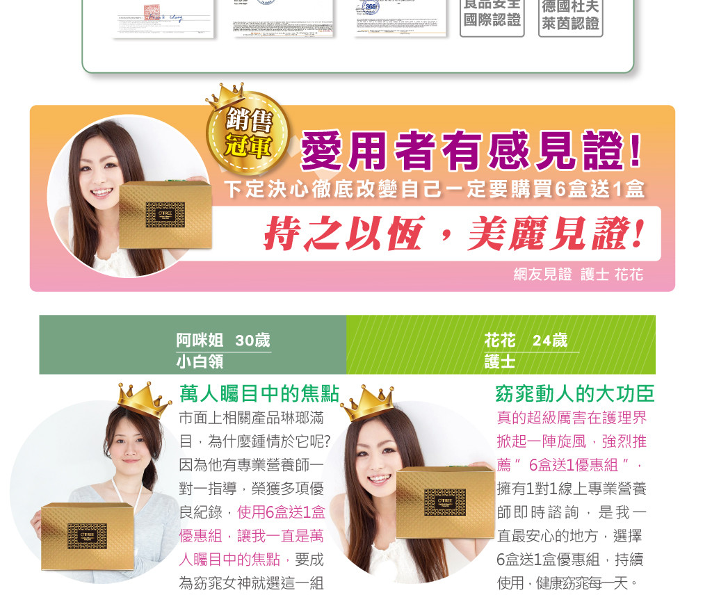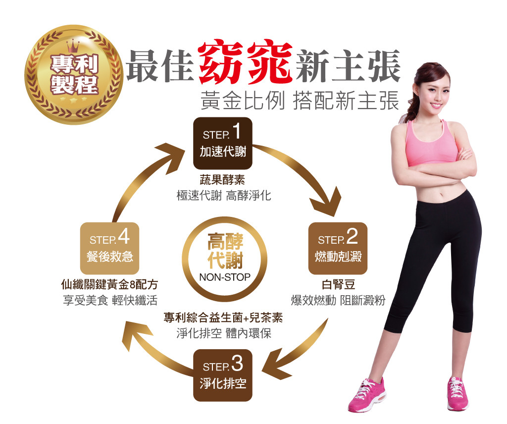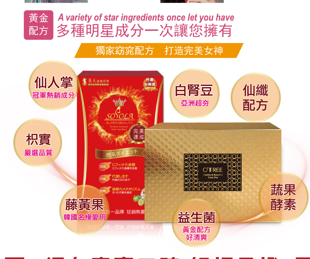 成 分:綜合蔬果酵素粉、專利綜合益生菌、綠茶萃取物、白腎豆萃取物、磷酸鈣、綜合蔬果抽出物、專利松樹皮萃取物、專利複合甘胺酸鋅、苦瓜萃取物(含專利胜肽)、神仙菜萃取物、專利非洲芒果種子萃取物、綠咖啡萃取物、苦橙萃取物、薑黃萃取粉、黑胡椒萃取物、啤酒酵母B群、海水抽出物(含鎂)。