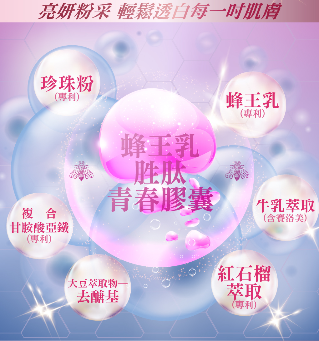成 分:紅石榴萃取(專利)、L-抗壞血酸、蜂王乳(專利)、大豆萃取物(去醣基)、牛乳萃取(含賽洛美)、芝麻萃取(含芝麻素)、複合甘胺酸亞鐵(專利)、生育醇、珍珠粉(專利)、二氧化矽