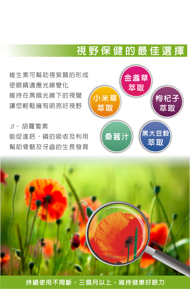 成 分:桑椹濃縮汁、小米草萃取、黑大豆穀萃取、枸杞子萃取、金盞草萃取(含葉黃素10%)、金盞草萃取(含玉米黃素5%)、B-胡蘿蔔素、維生素B2、維生素B12